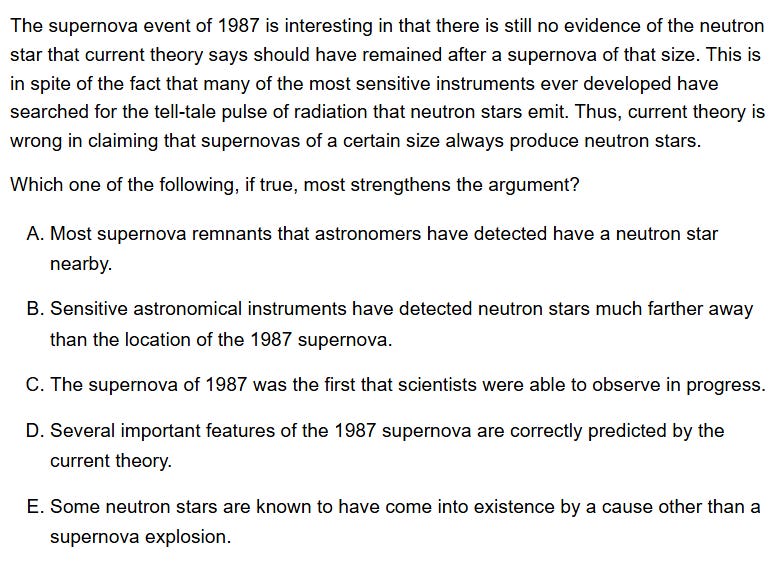 A mere coup d’oeil at stuff like LSAT scores is discouraging for CTH, too. LSATs should function decently as a measure of critical thinking skills because they test people’s reading comprehension, capacity to break down arguments and locate their weaknesses/vulnerabilities, etc. The LSAT’s makeup has been altered a few times in recent years, but here’s a logical reasoning sample question: