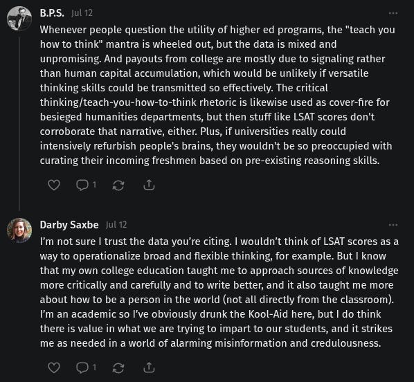 Here’s a pseudo-paradox about critical thinking: the more readily you believe in it (and the accompanying presumption that it’s only really acquired through formal education), the less of it you do, probably. Maybe that’s kind of nonsensical, but I’ve never fully understood how students/parents view the function of universities as a mechanism for labor market signaling throughout their educational journey, yet somehow this charade about critical thinking is undying. For decades, higher ed (and particularly the humanities) have been insulated from jeopardy by these enduring canards about critical thinking and the adjacent notion that they’re (higher ed, especially the humanities) unique vehicles for reshaping people’s brains and imbuing them with the ability to think well. Even now, with the long-term downsides of our top-heavy educational setup crystallizing into focus and the economic payout—an onramp to the salaried white-collar job market—plainly imperiled, this fairytale about critical thinking is still marshaled in defense of these vampiric institutions.